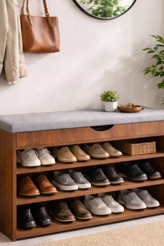 Busy entryways usually collect the most clutter, especially shoes. A storage bench with built-in shoe shelves solves that problem by giving every pair a clear place to go.