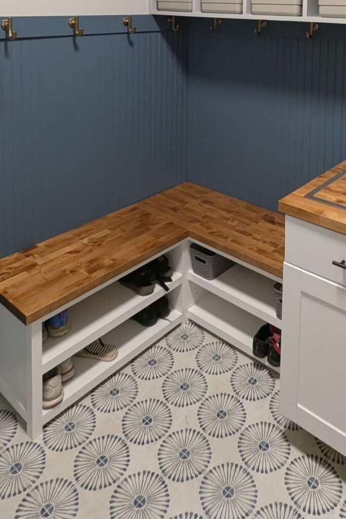 Unused corners often become dead space, especially in mudrooms or laundry areas. An L-shaped storage bench turns that overlooked corner into a practical seating.