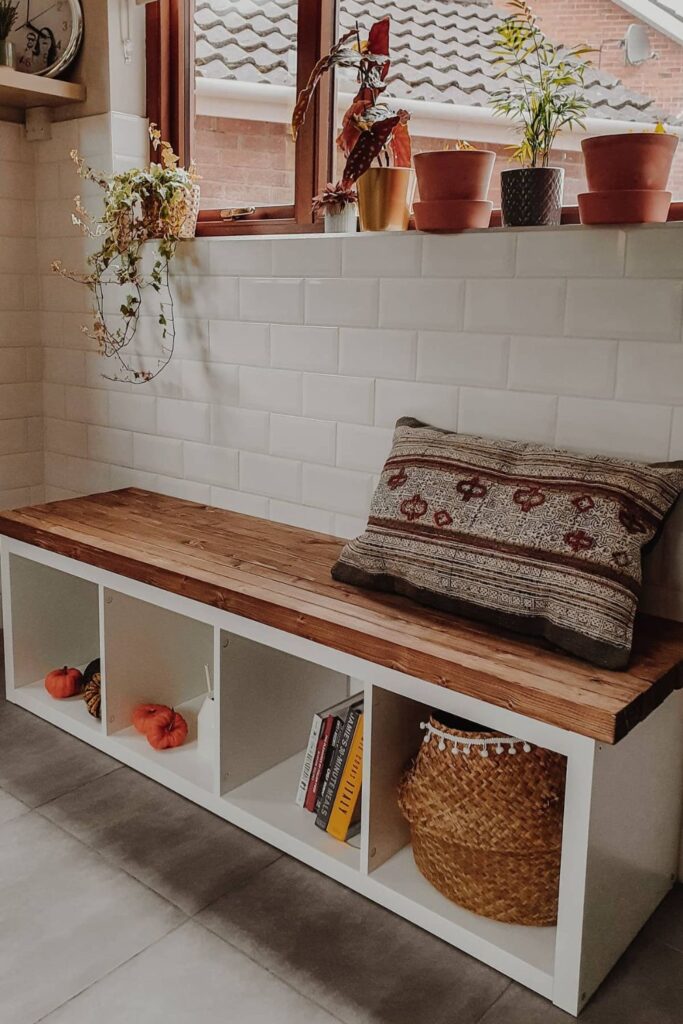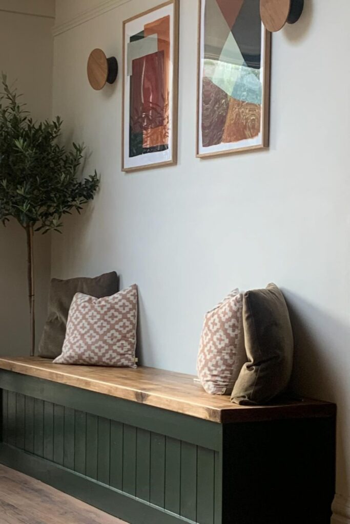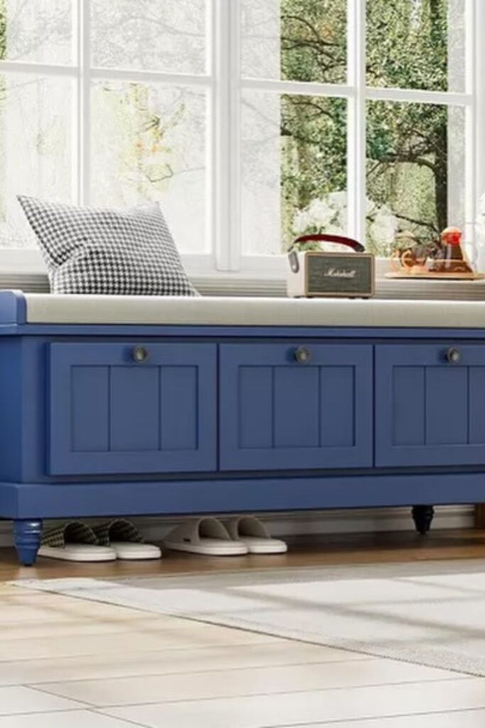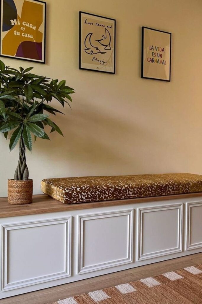 This idea works best in hallways, dining nooks, or quiet seating areas because the bench combines storage with furniture-style design.