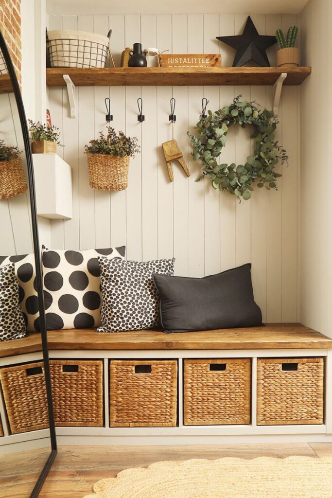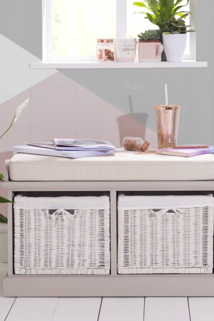Small storage problems often need a simple solution rather than a large cabinet. A compact bench with wicker baskets underneath creates quick hidden storage.