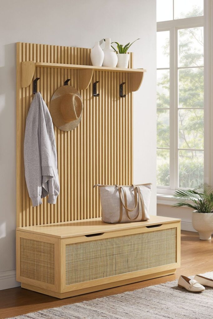 Daily routines become smoother when the entryway works like a small command center. A storage bench paired with wall hooks and an upper shelf.