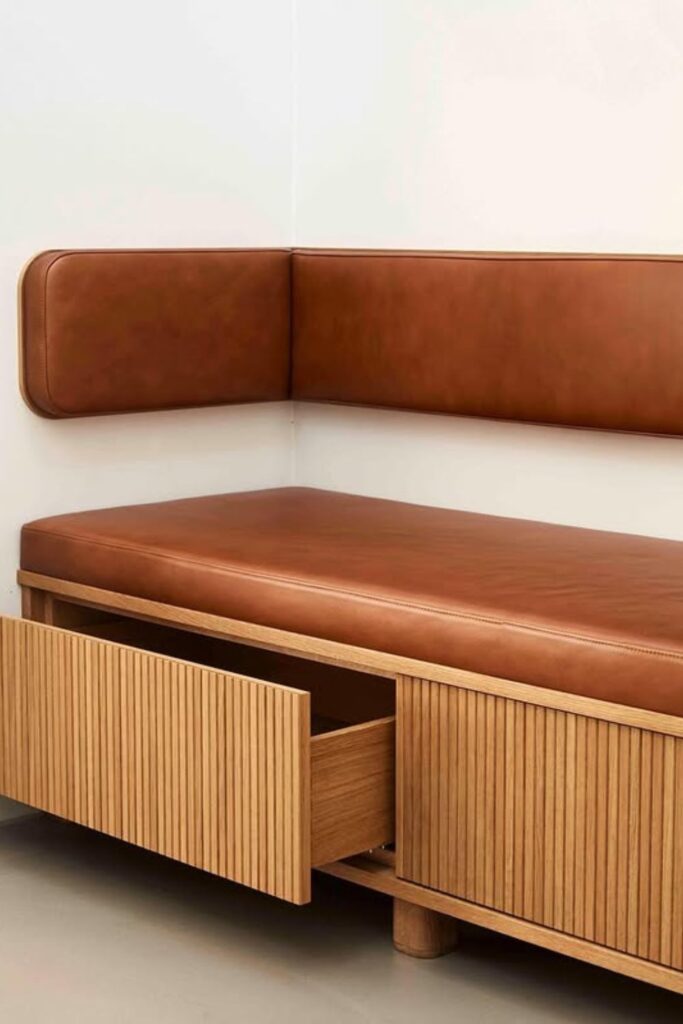 Clean design often hides the smartest storage. A bench with fluted drawer fronts keeps clutter out of sight while still offering and easy access to everyday items.