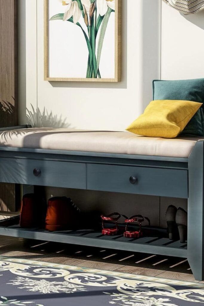 Shoes can stay near the bench, while things like gloves, scarves, or reusable bags can stay inside the bench compartment.