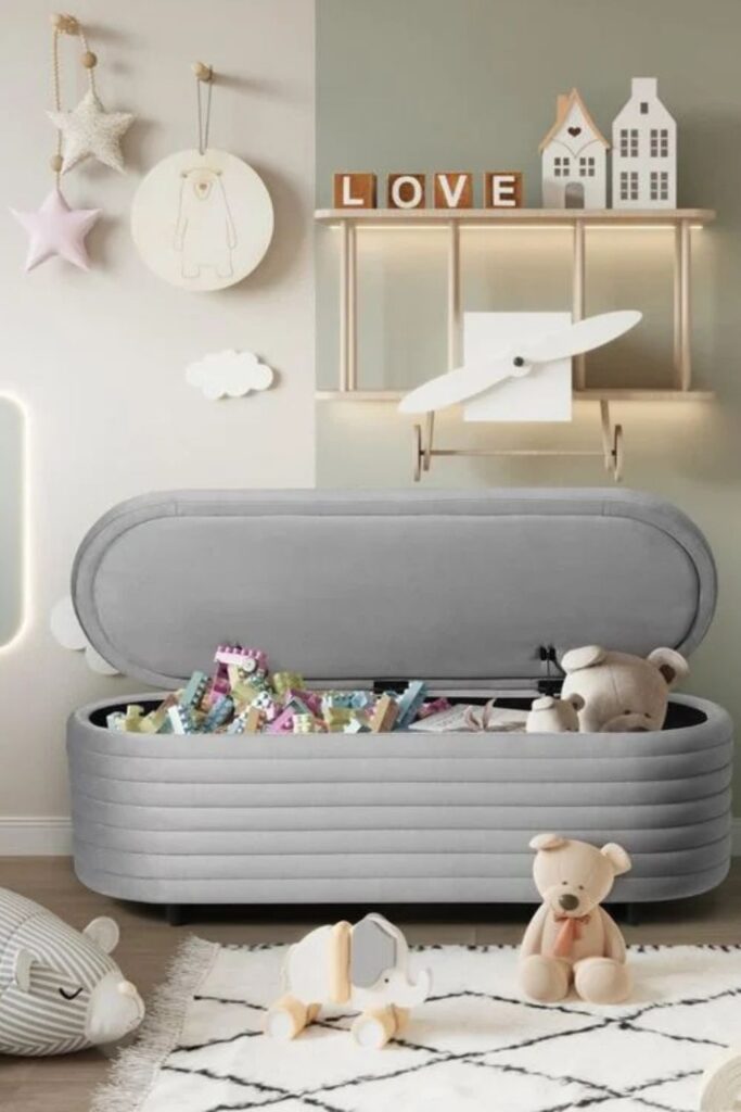 Playrooms fill up quickly once toys start spreading across the floor. A lift-top storage bench keeps that chaos under control while still giving kids easy access to their favorite things.