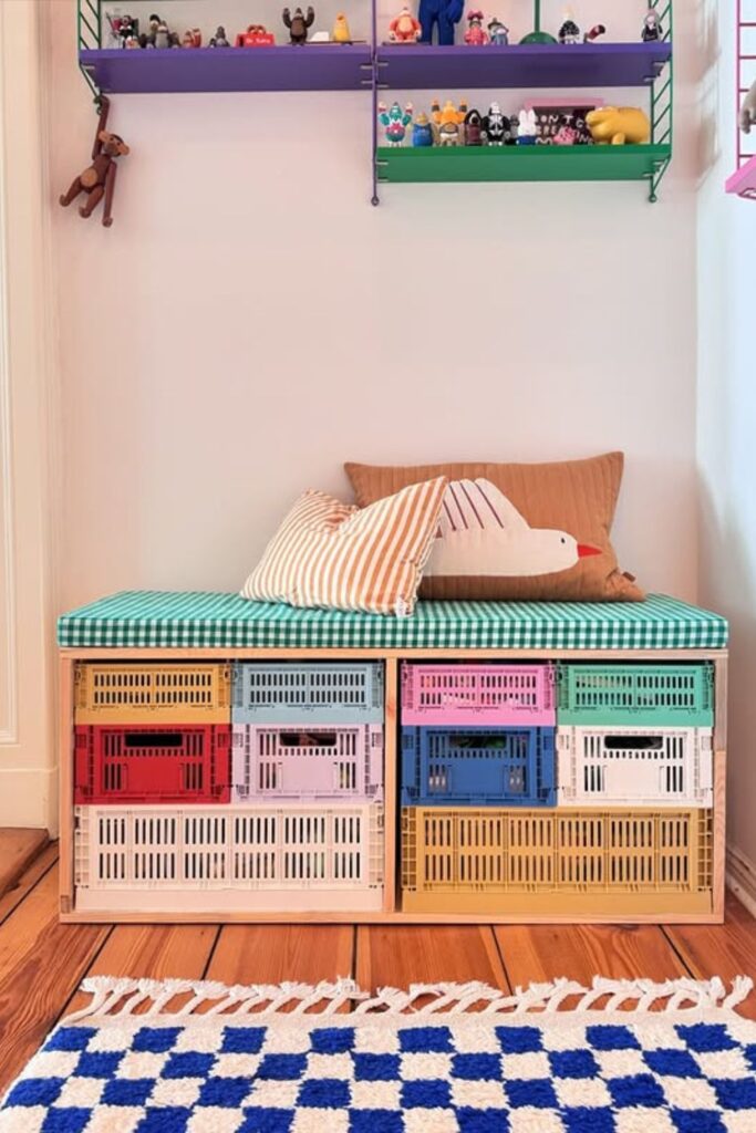 Colorful crates turn a simple bench into a flexible storage system that grows with your need. Instead of fixed shelves, stackable crates slide in and out easily.