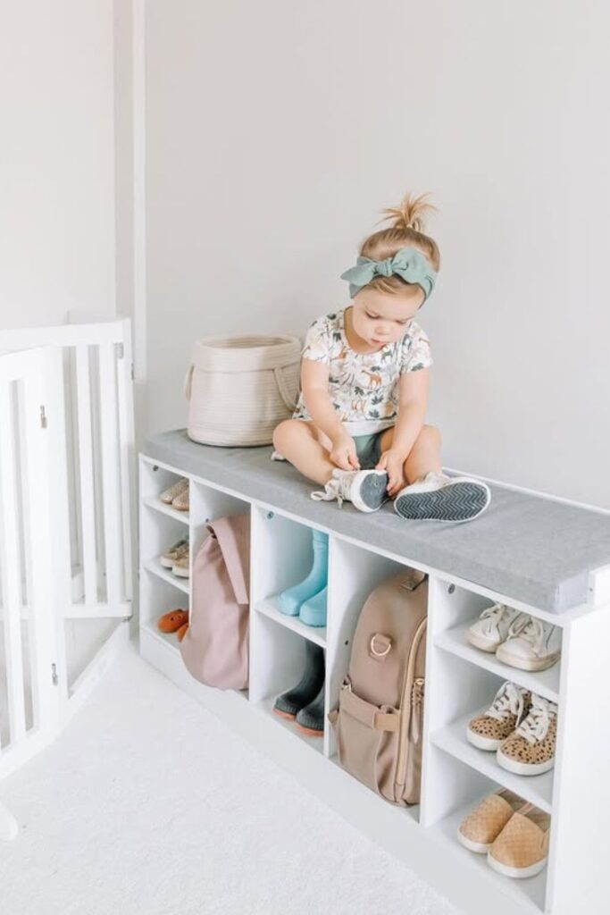 Daily routines become much easier when every item has its own small space. A bench with open cubbies underneath creates a simple system.