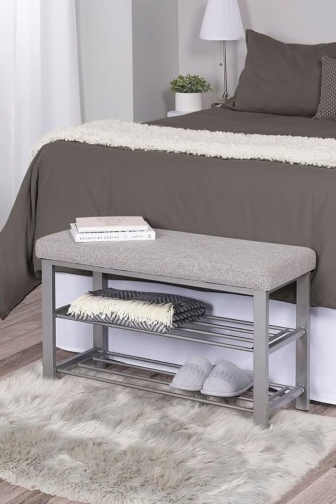 Bedrooms often lack a simple place to keep extra blankets or throws within reach. A bench with an open lower shelf solves that quietly by giving soft items a neat resting spot.