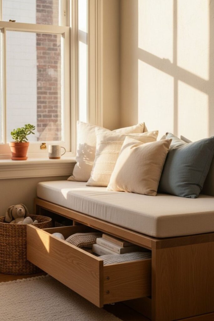 Quiet spots near windows often become the most relaxing places in a home. A window bench with built-in drawers adds useful storage without interrupting that peaceful corner.
