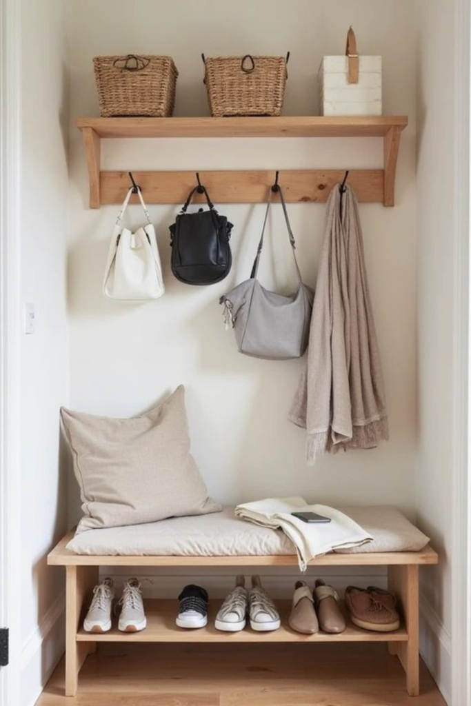 Start with a bench to handle shoes and daily bags, then add hooks for grab-and-go items. A single shelf above.