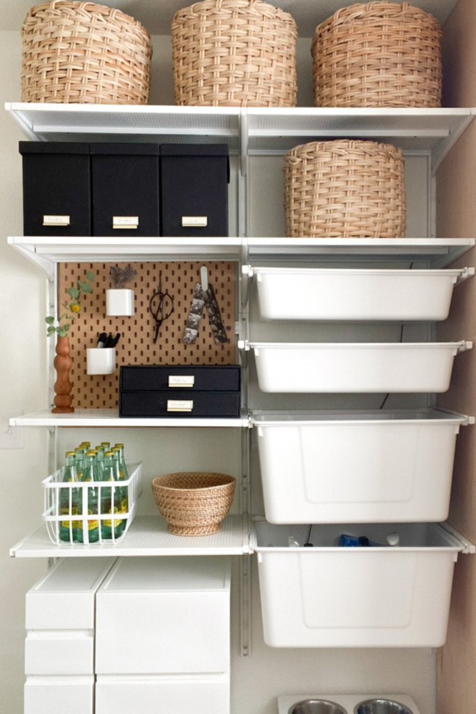 Making it perfect for laundry rooms, closets, or utility corners. Use adjustable wall-mounted shelves and labeled bins.