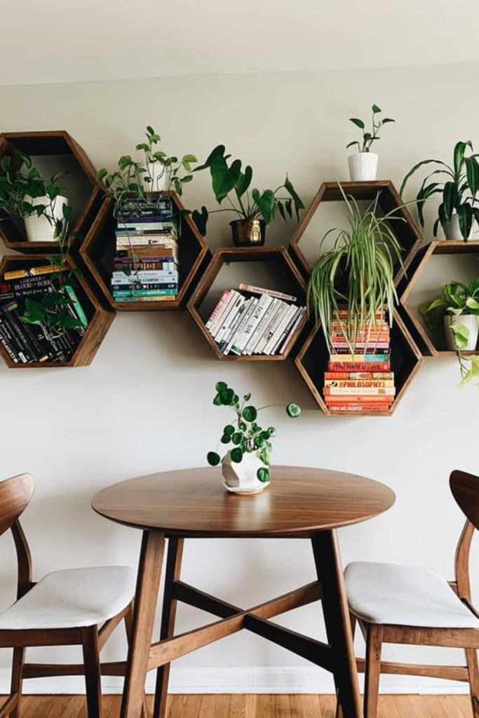 Install individual units to spread storage without blocking light or movement. Mix books with plants to keep it visually light.