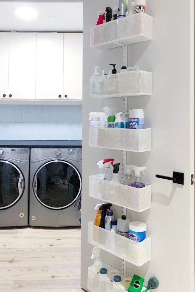 Cleaning supplies don’t need a whole cabinet to themselves. Using the back of a door creates vertical storage.