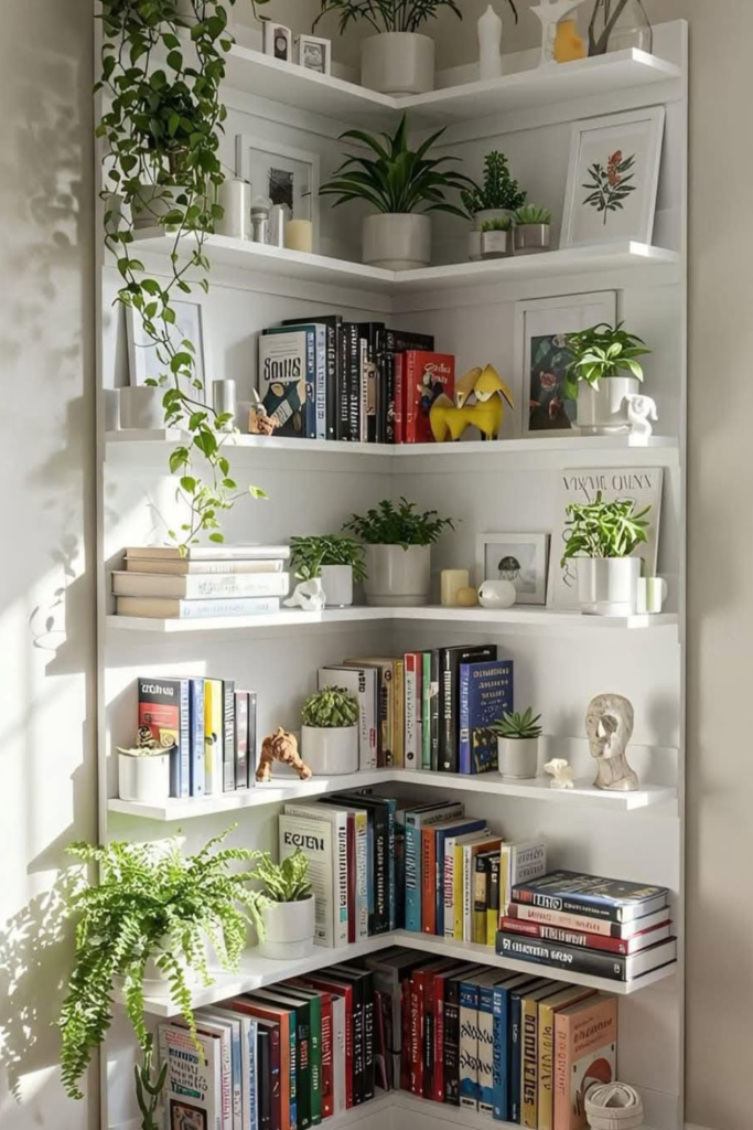 Build shallow shelves so the corner stays light instead of bulky. Mix books with plants to avoid visual clutter.