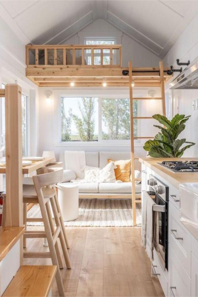 A lofted platform creates storage or sleeping space above daily living areas, making it ideal for tiny homes or studios.