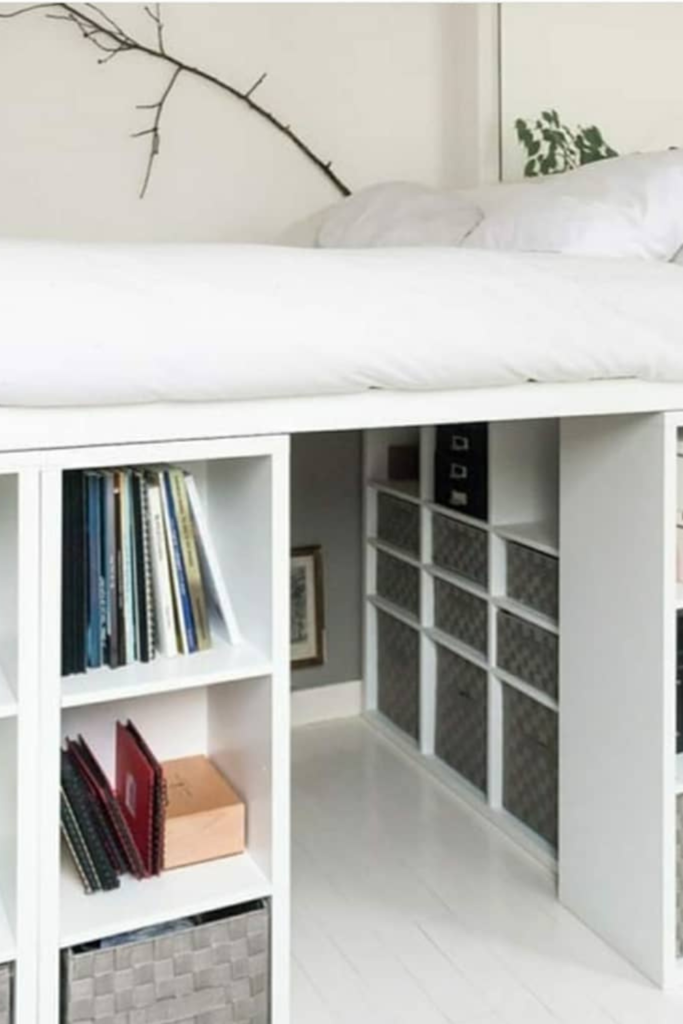 Beds take up the most space, so they should work harder to fit. Build cubbies or drawers under the platform.