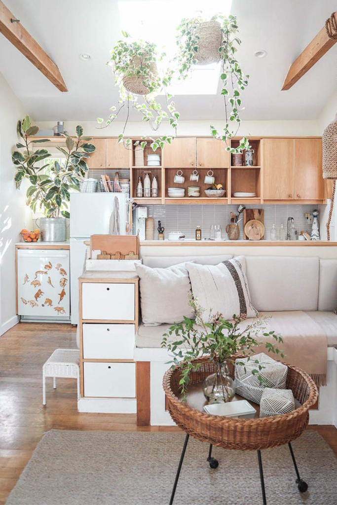 Build it using open cubed shelves so light still passes through while storage grows vertically. Books, plants, and baskets.