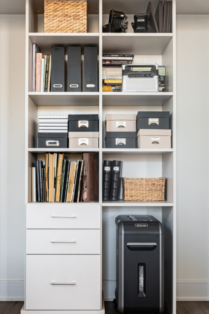 Paper clutter grows fast when work zones spill into the living space. Turning a closet into office storage works best.