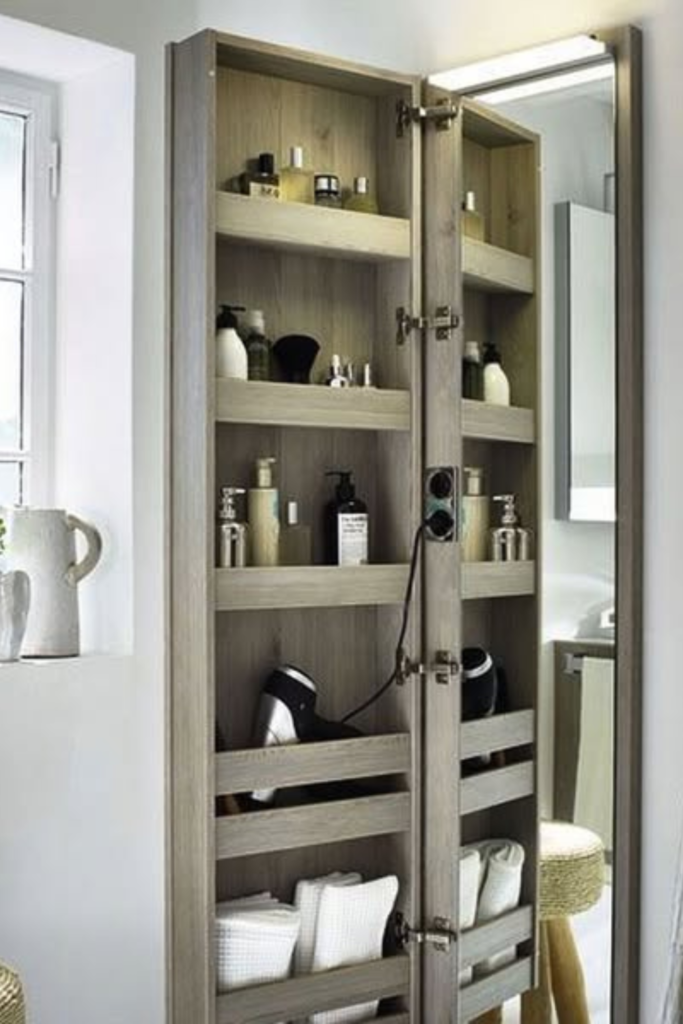 Bathrooms feel smaller when storage stays shallow. Choose adjustable interior shelves to neatly store bottles and tools.
