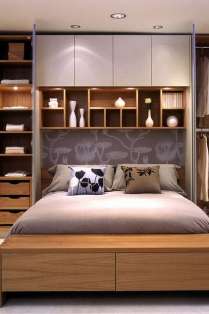 Surrounding the bed with floor-to-ceiling storage works best in small bedrooms. Use modular cabinets or custom shelving.