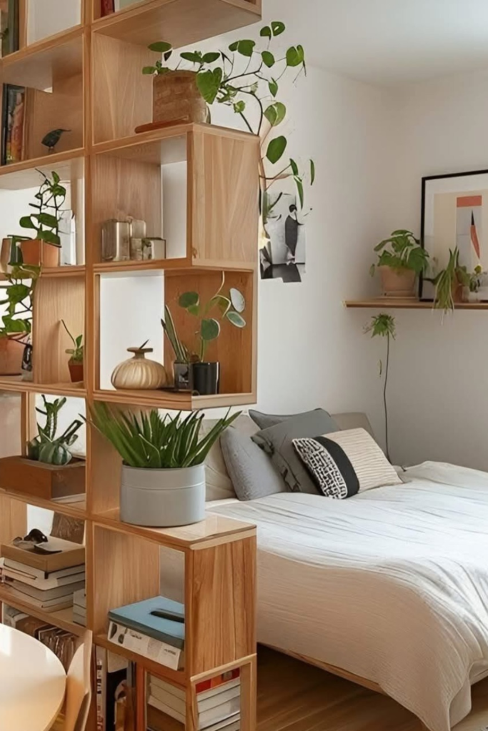 One wall can do two jobs at once, shelving divider works best in studio apartments or bedrooms that double as living spaces.