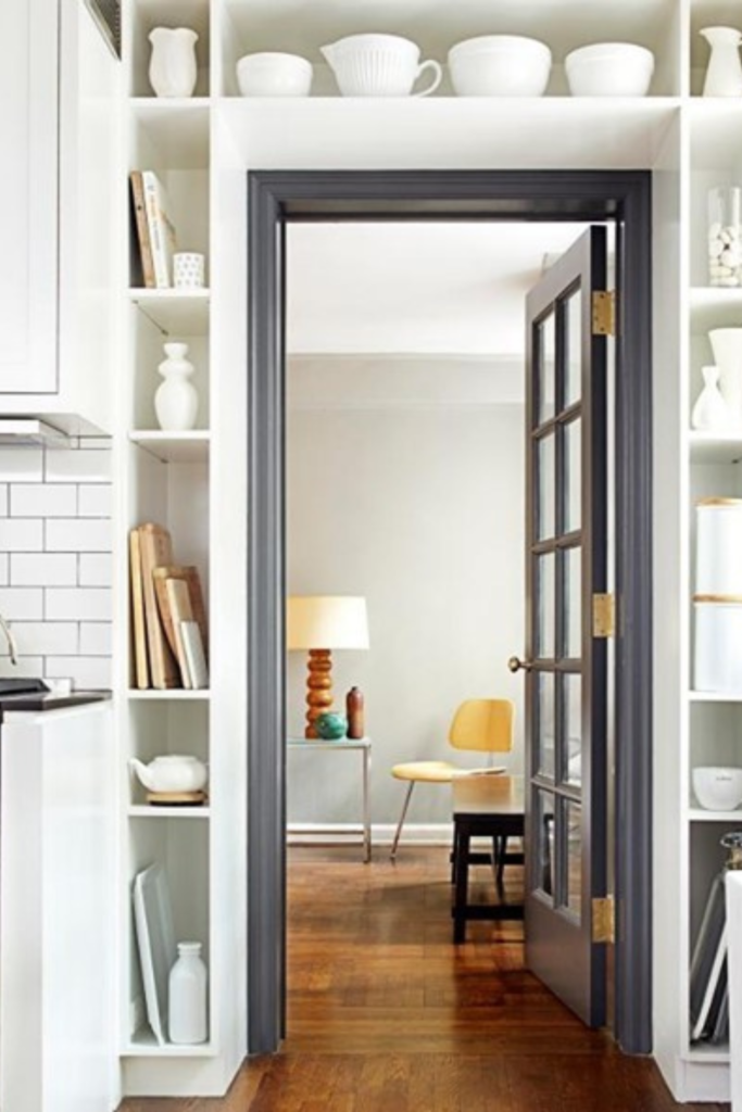 Doorways hide serious storage potential. Wrapping a doorway with built-in shelves works best in small kitchens.