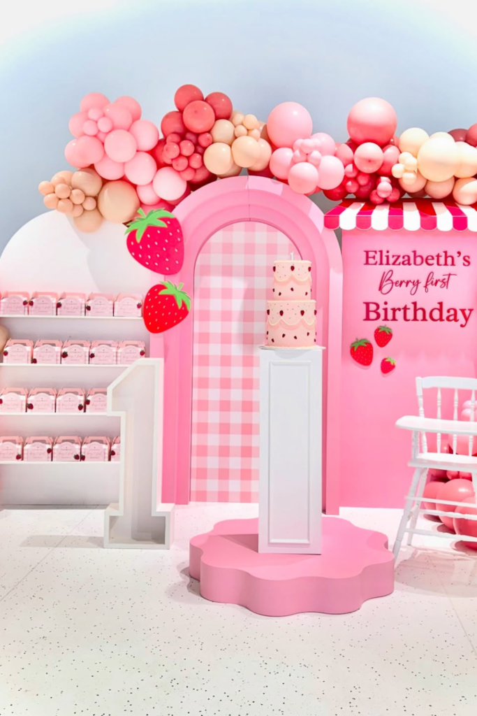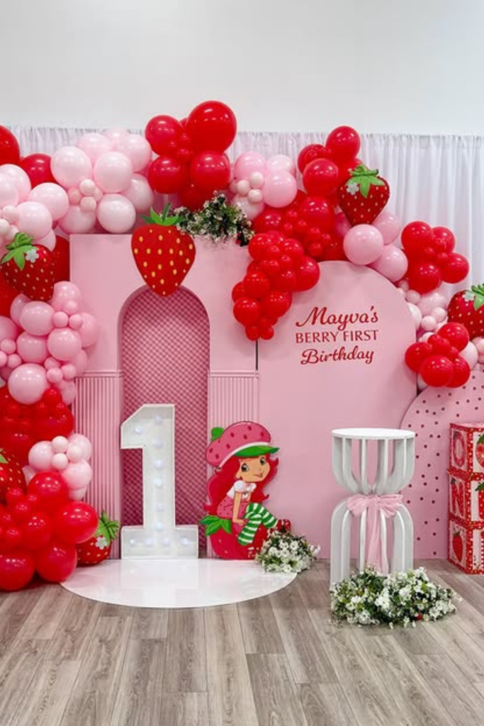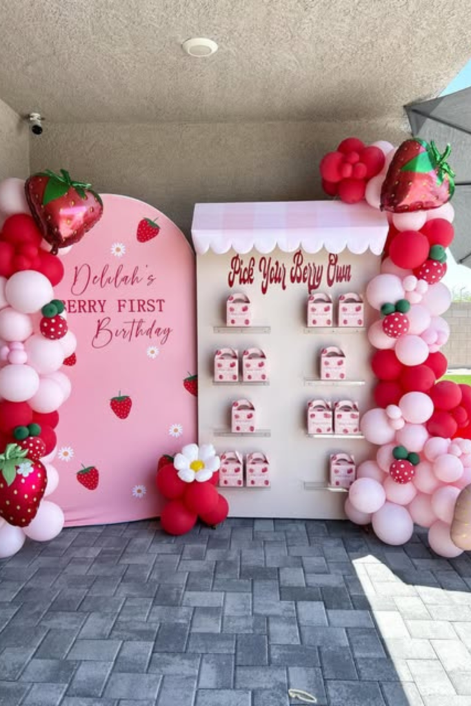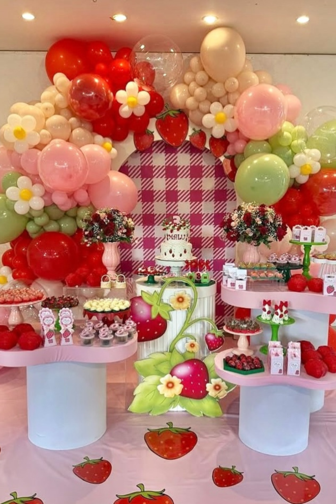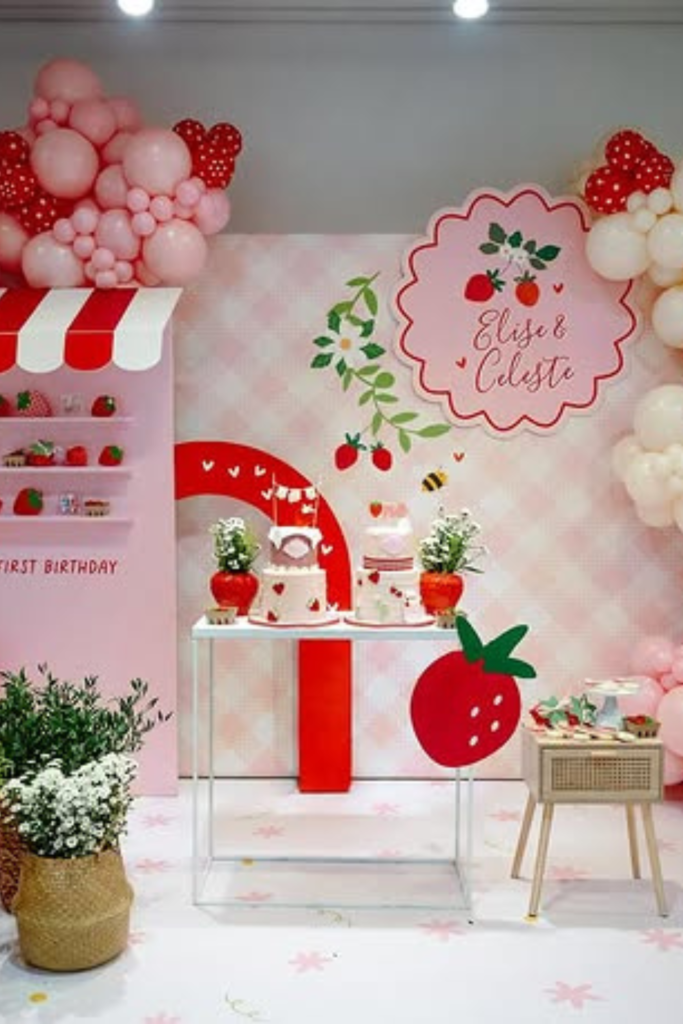 Add large strawberries or fruit baskets in front to break the backdrop’s flat look. Keep balloon clusters full but controlled.