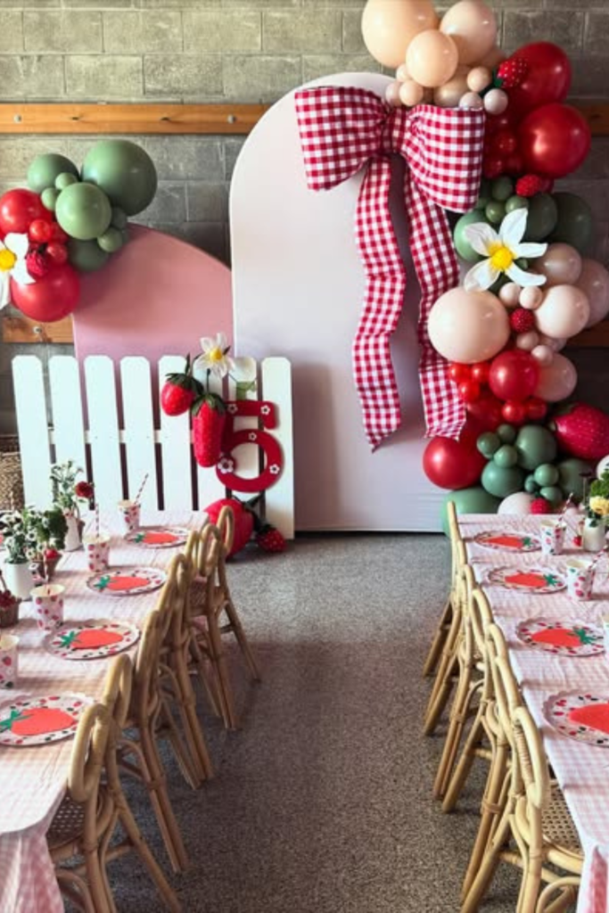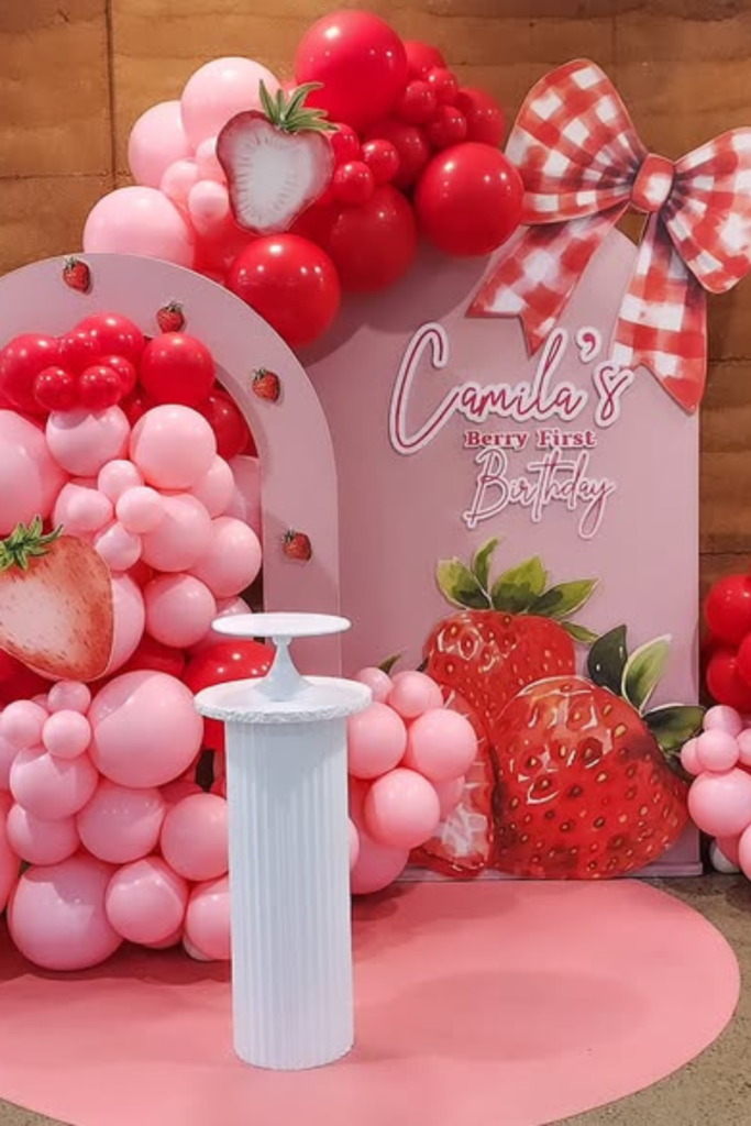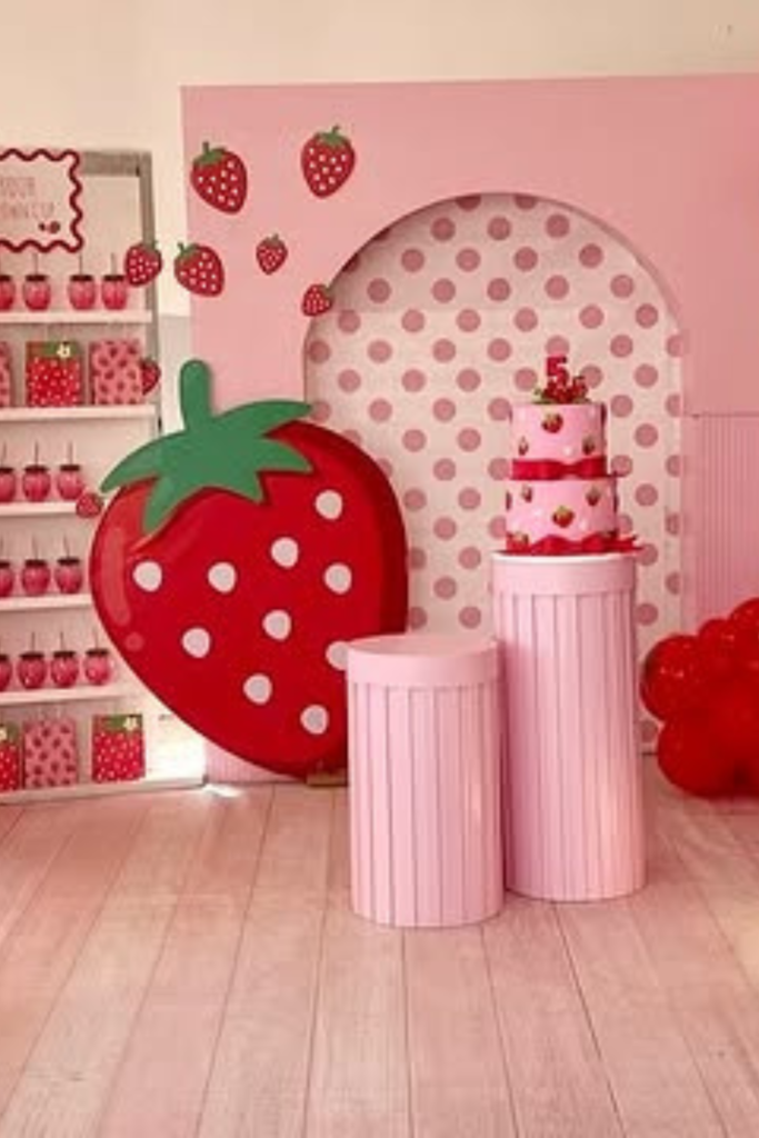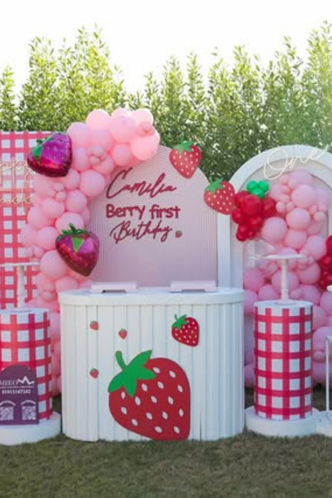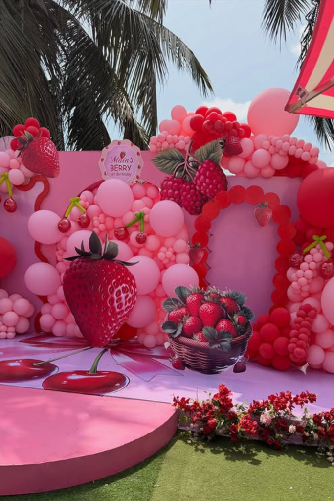 Add large strawberries or fruit baskets in front to break the backdrop’s flat look. Keep balloon clusters full but controlled.