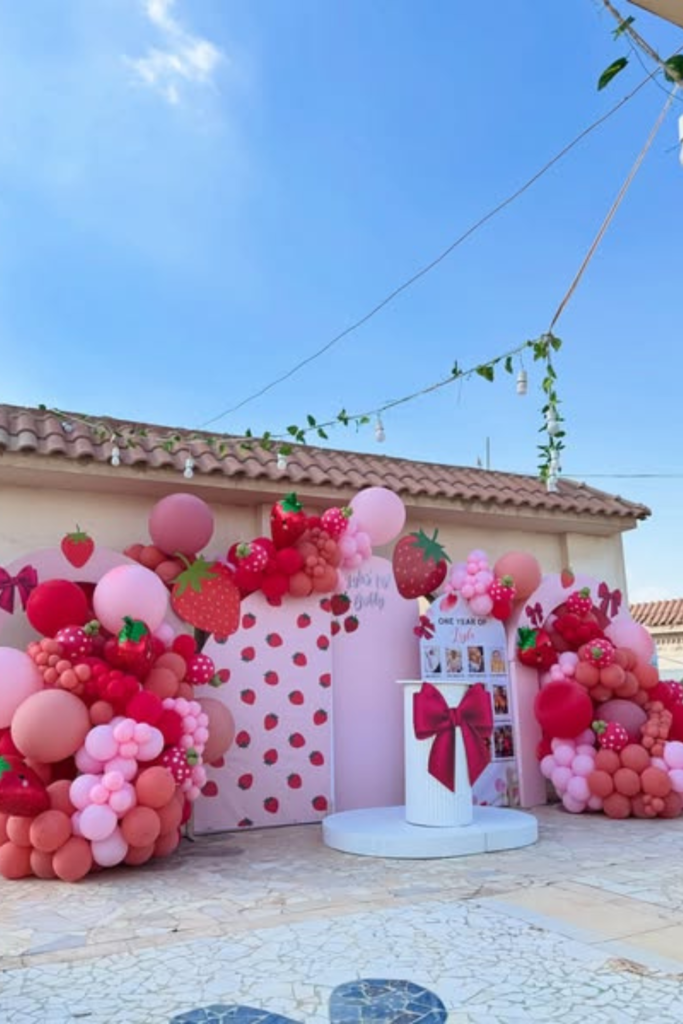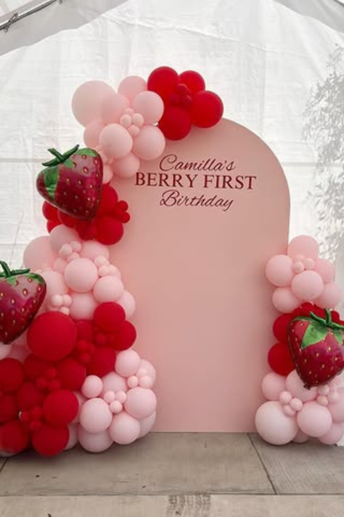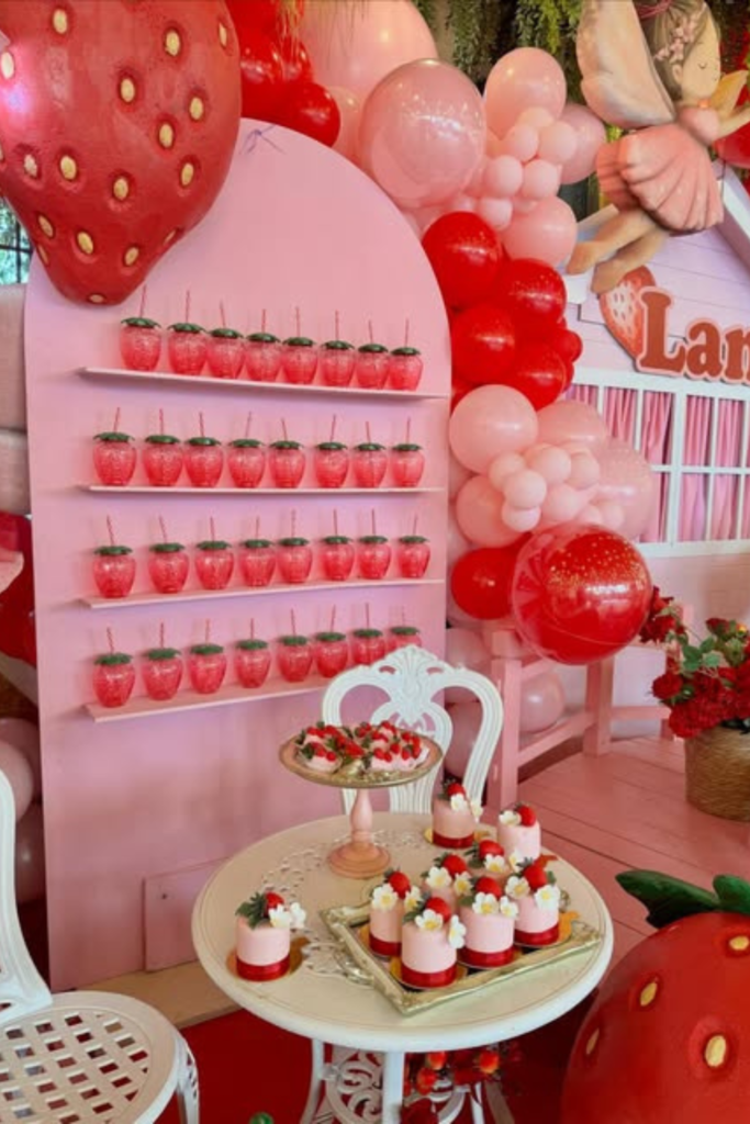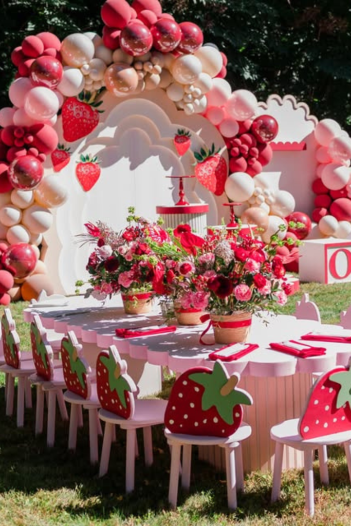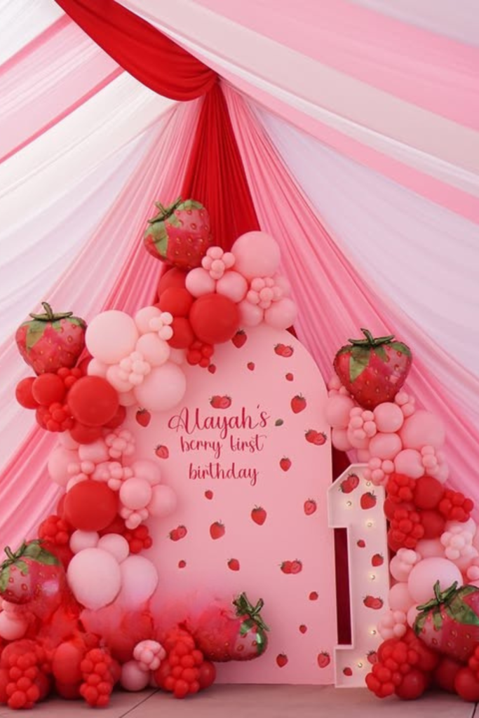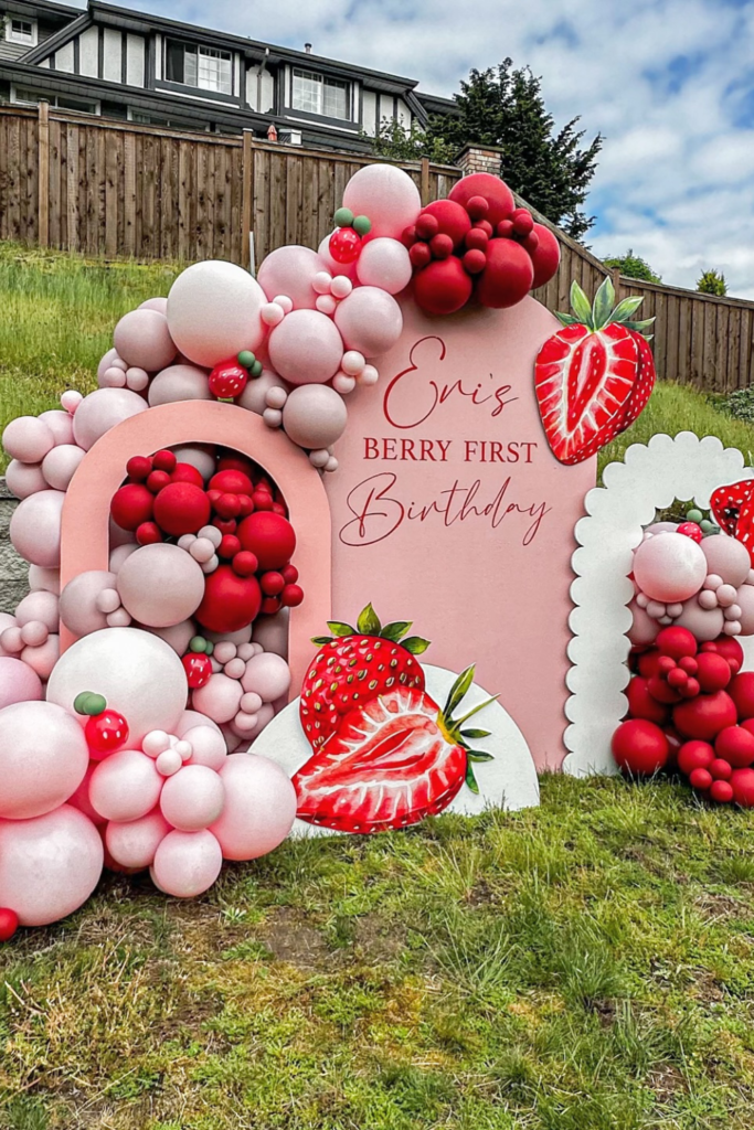 Add a statement piece like this when you want the setup to feel styled. Keep balloon clusters soft with a mix of red, pink, and a touch of green to mimic real strawberries.
