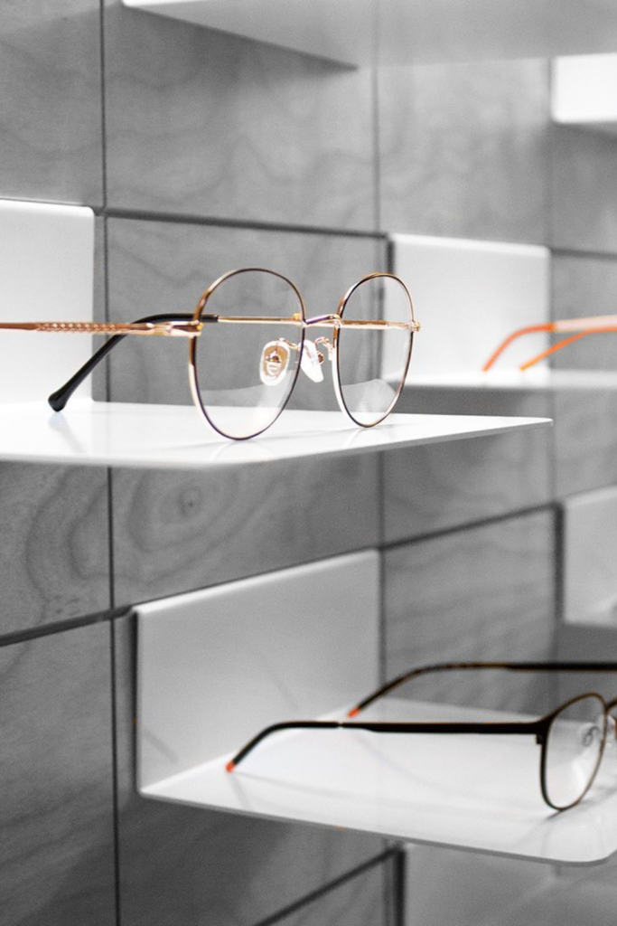 A clear acrylic stand that divides each pair by level to prevent lens contact can be used to replicate this style.