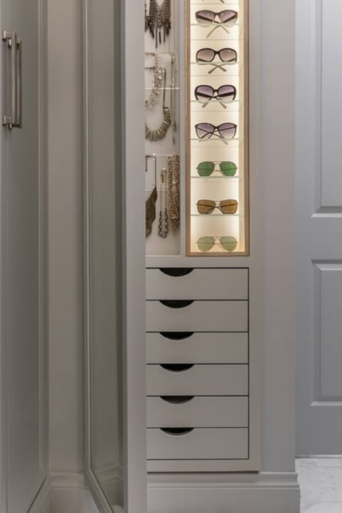 Accessories work best as a group in dressing rooms with little storage, using a jewelry drawer for sunglasses is a good idea.