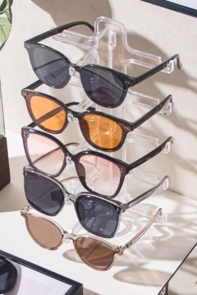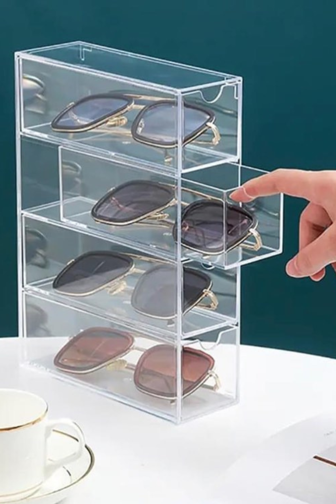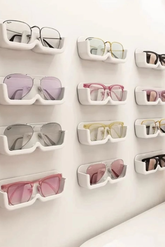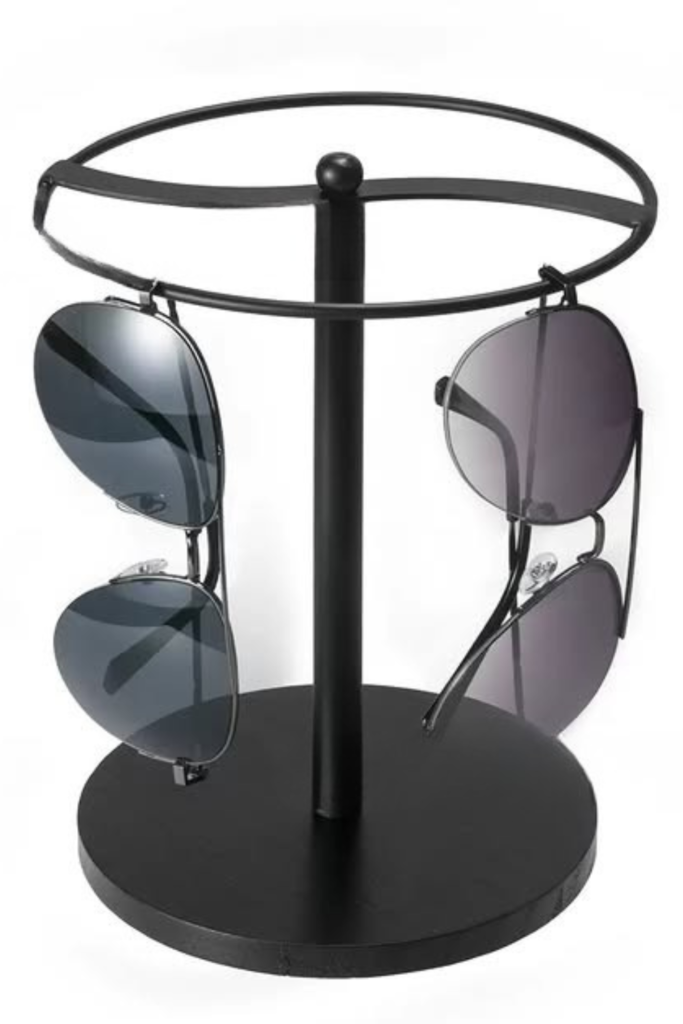 On shelves, desktops, or dressers where sunglasses are frequently rotated, a tiered tabletop rack is a good option.