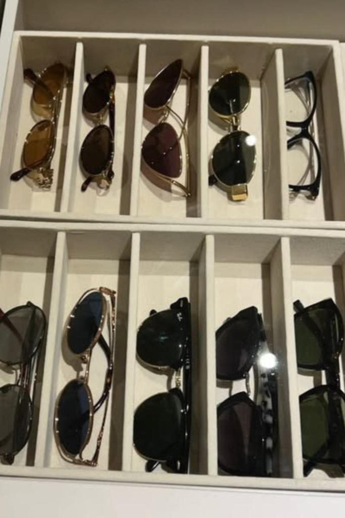 Sunglasses are both accessible and safe. Use modular trays that fit your frames or movable drawer dividers to recreate it.