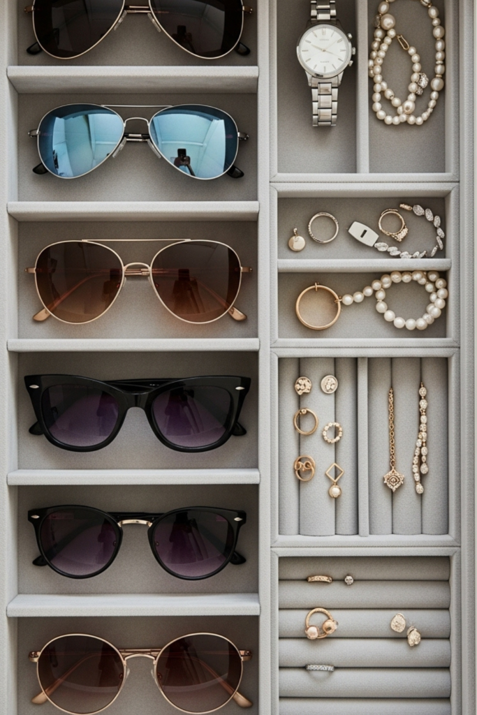 When sunglasses have their own area, storage feels deliberate, works well in dressing rooms or closets.