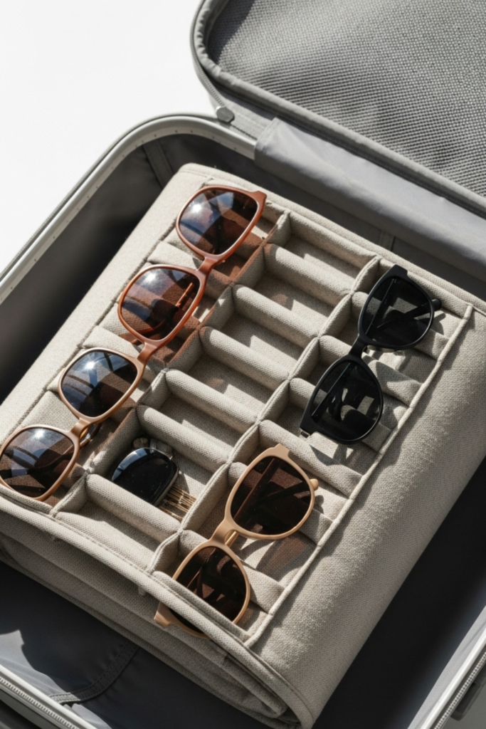 Padded fabric matter more than how fancy the organizer looks. If sunglasses stay still and separated, scratches stop being a problem.