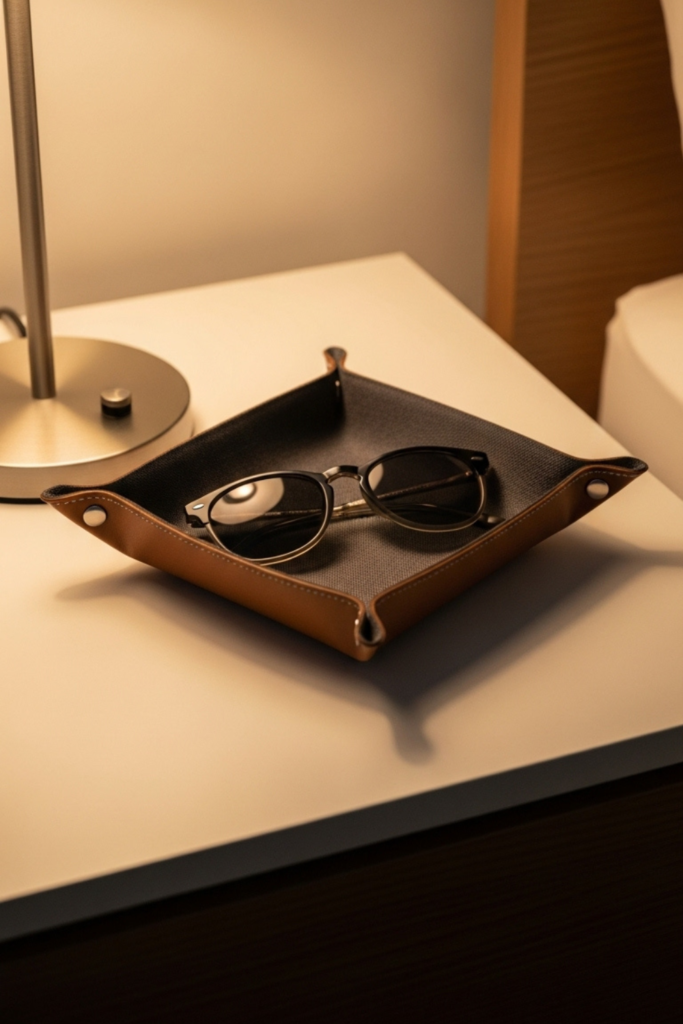 Use a soft-lined or leather tray to avoid scratches. Minimal setups work well under warm bedside lighting, creating a calm drop zone.