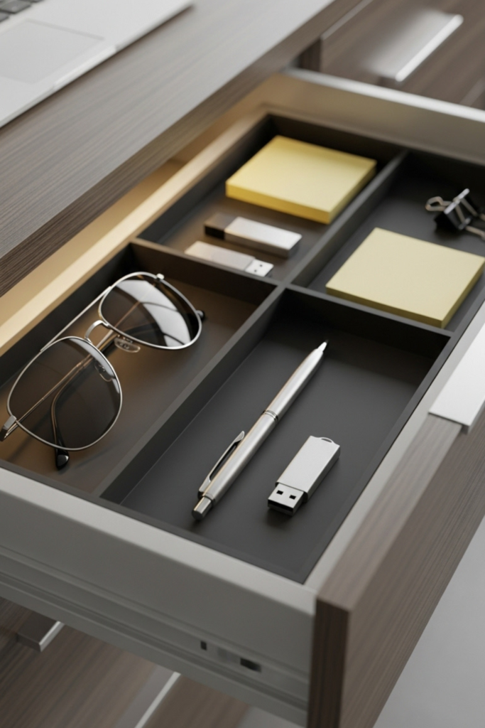 A shallow desk drawer with a thin organizer. Rubbing against electronics is avoided by separation, careless placement.