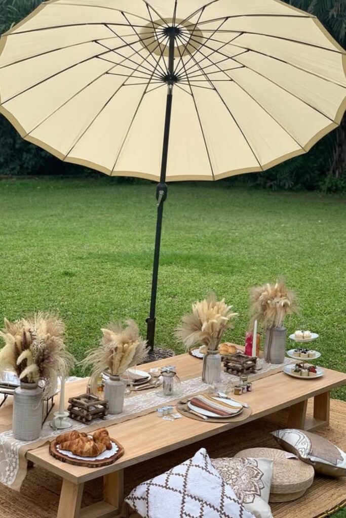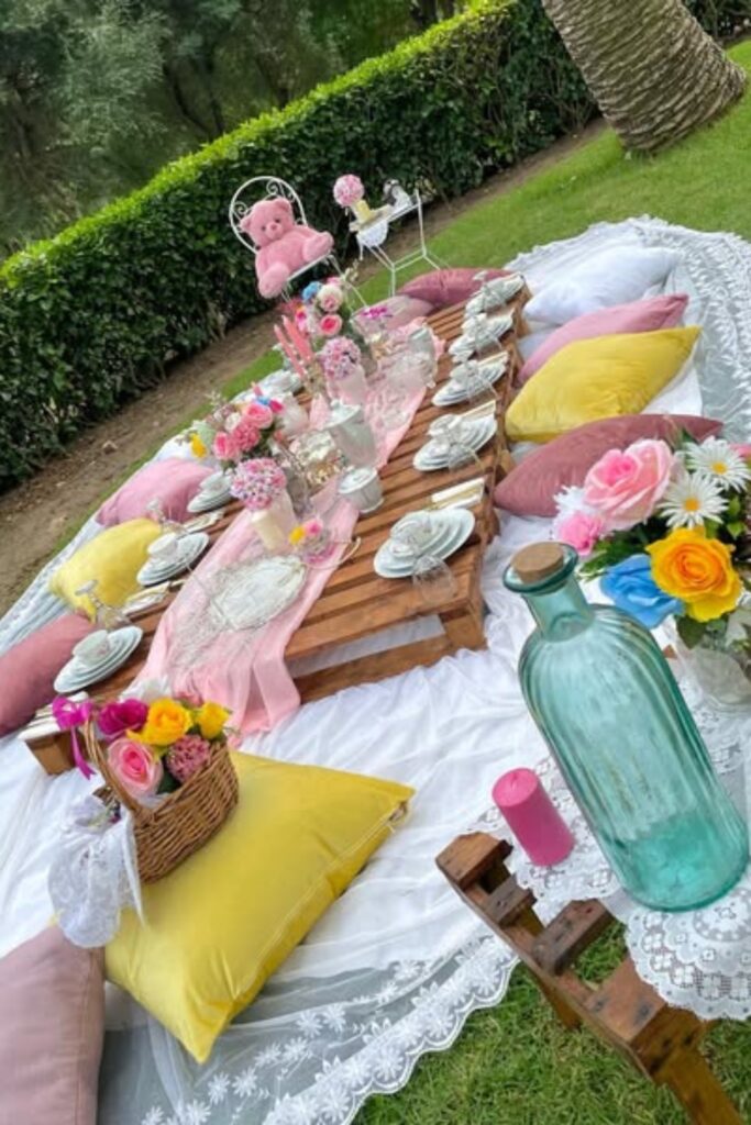 A low wooden table on a lace-trimmed blanket gives it a cozy picnic feel, while pastel pillows make seating comfortable.