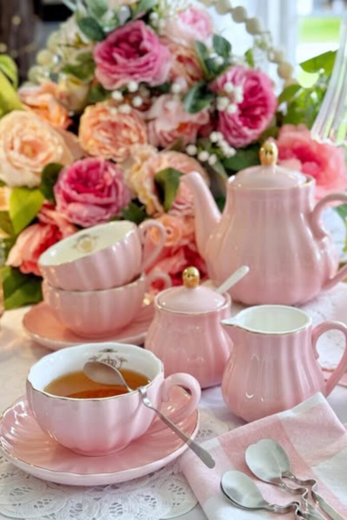 Matching pink teacups and a teapot keep the design cohesive and elegant. Natural daylight makes the soft pink tones glow.