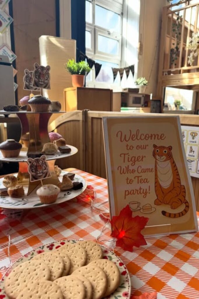 A checkered tablecloth adds a fun picnic feel, while a tiger sign instantly sets the theme.