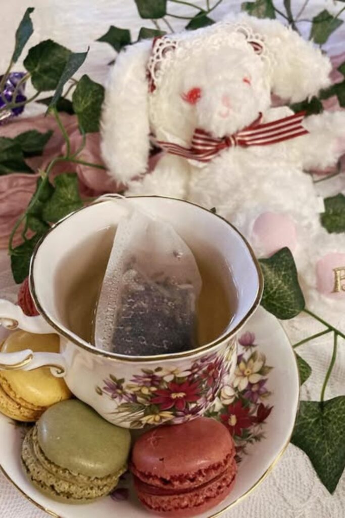 A floral teacup filled with pastel macarons. While a plush bunny makes the scene playful and inviting.