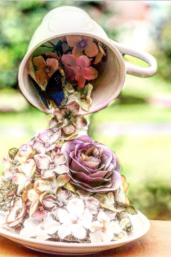 A floating teacup spilling flowers creates a magical, whimsical effect that draws everyone’s attention.