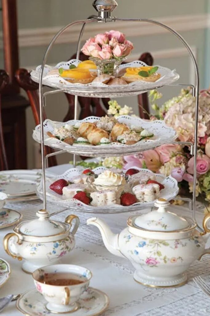 Tea party protocol keeps things elegant yet simple. Guests are seated, tea is poured fresh, and food is served in courses, savory sandwiches first, then scones, and finally sweets.