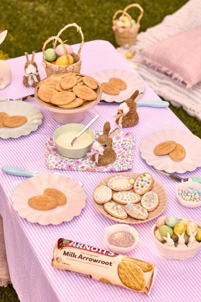 A pastel tablecloth, bunny figurines, and baskets of eggs instantly set a cheerful mood.