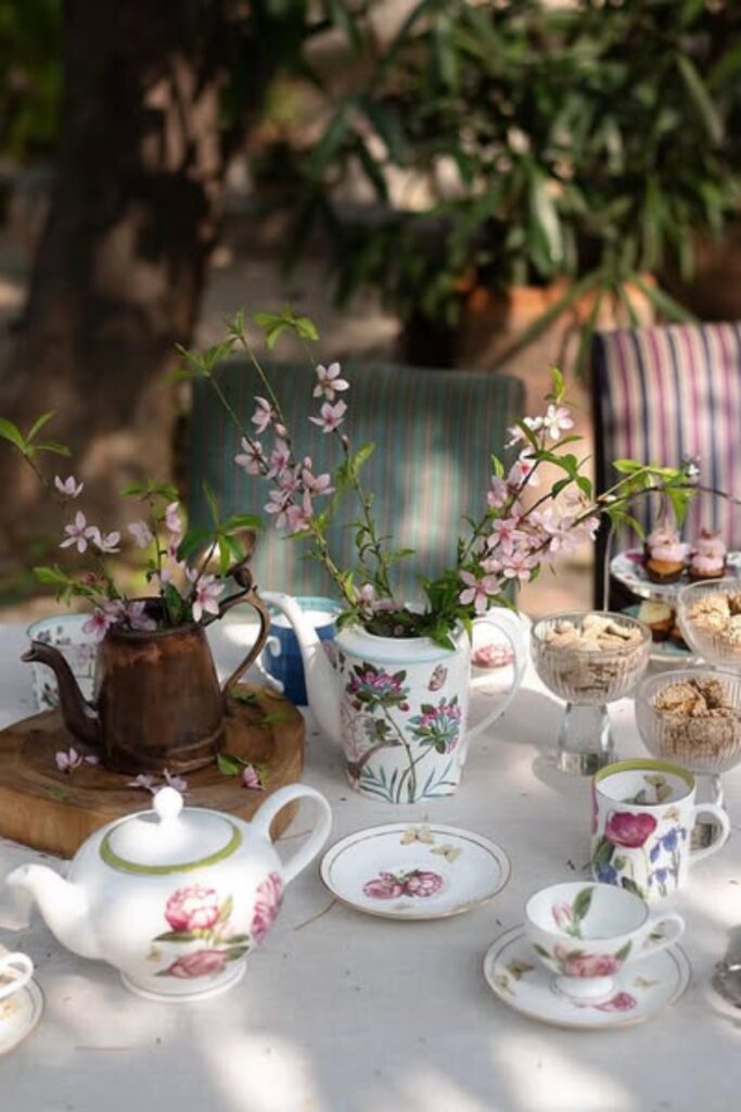 Mixing different floral teacups adds character without needing everything to match. Add a few hanging lights to bring warmth.
