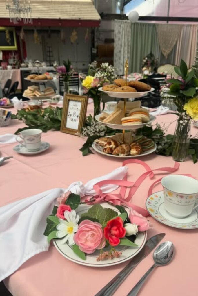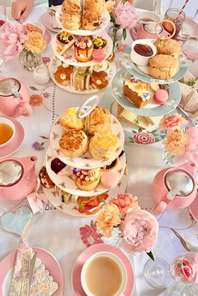 Soft pink linens set a gentle base, and floral centerpieces with tiered trays of scones and sandwiches make the table inviting.