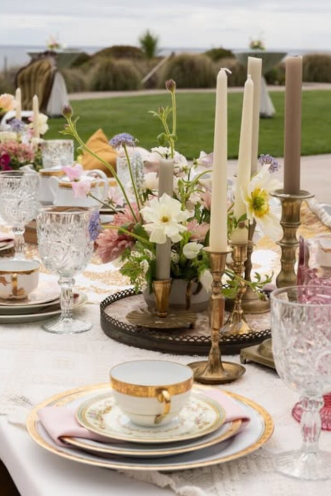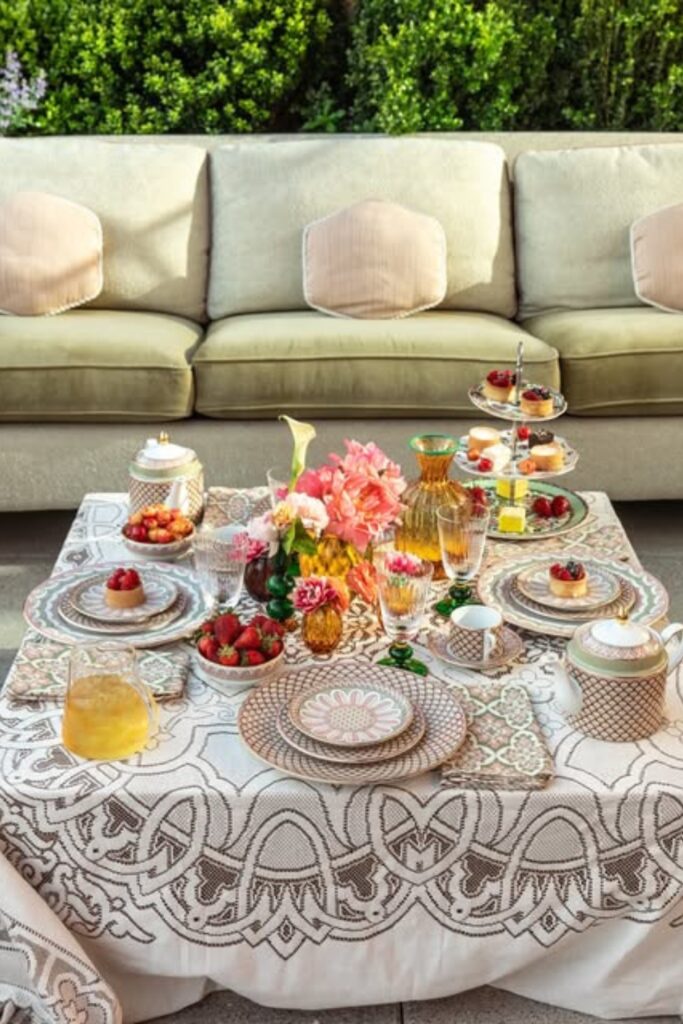 A patterned tablecloth anchors the table, while gold-accented teaware and glassware add a touch of luxury.
