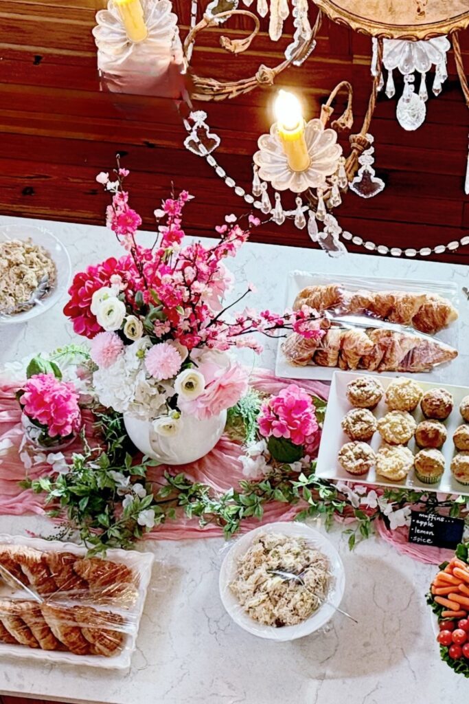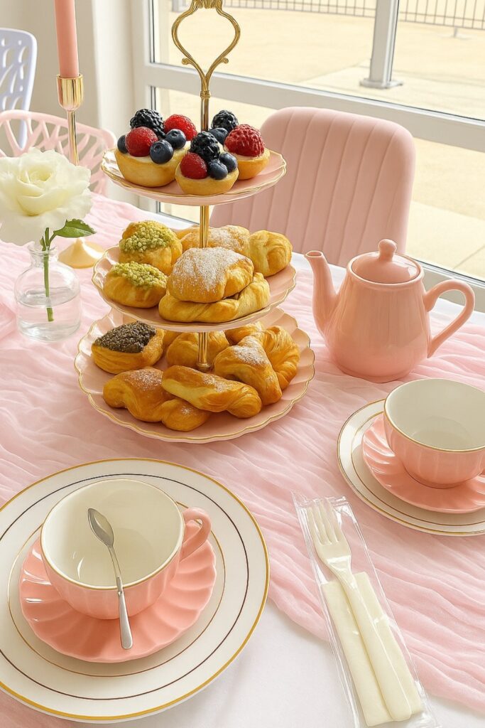A pink fabric runner sets the tone, while a tiered tray filled with croissants and berry tarts makes the table instantly inviting.