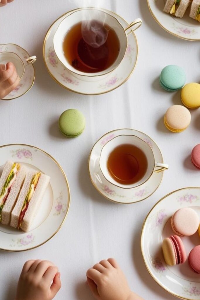 This idea turns a simple table into a sweet memory for little guests.Light sandwiches and colorful macarons make the setup playful and easy to enjoy.