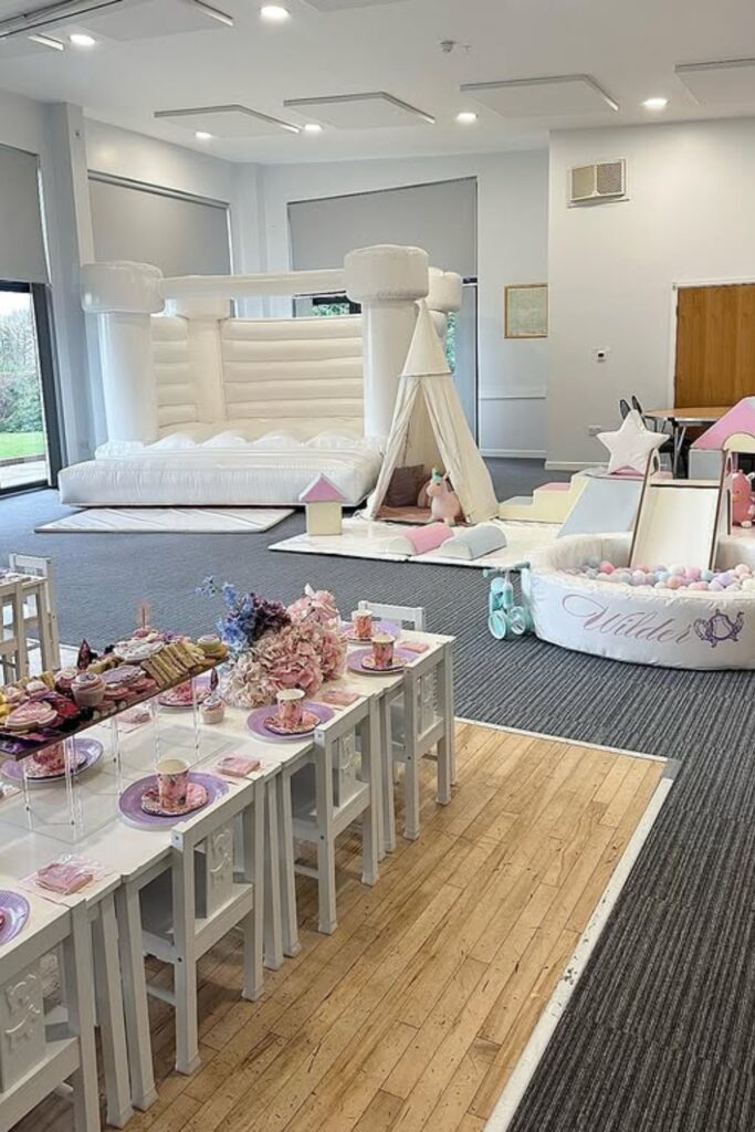 Pastel teacups and floral accents make it feel special. A bounce house, play tent, and ball pit create a playful backdrop.