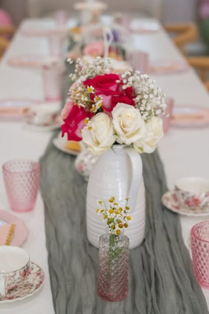 A soft fabric runner sets the base, and a white jug with roses and baby’s breath adds a natural touch.